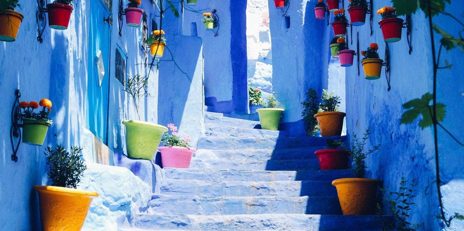 Chefchaouen est une ville marocaine particulièrement authentique, avec des murs de maison blanchis à la chaux également teints en bleu avec un pigment minéral appelé bleu pâle. Cette décoration bleue donne un charme fou aux rues de la médina, que l'on peut aussi visiter en empruntant les escaliers et les ruelles très étroites. Les portes des maisons sont également bleues et certaines ressemblent à de véritables œuvres d'art. C'est une chance de se reposer car c'est une ville escarpée.